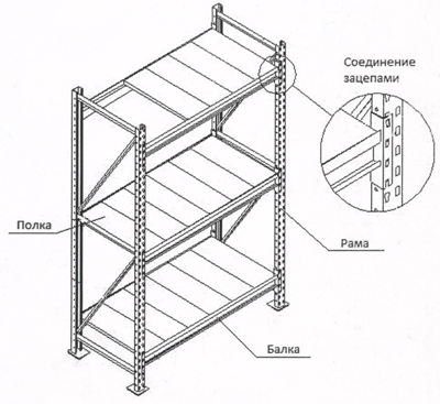 Основу конструкции составляют сварные рамы, горизонтальные балки и полки. Балки крепятся к раме при помощи зацепов, укомплектованы фиксаторами. На балки сверху укладывается комплект полок.